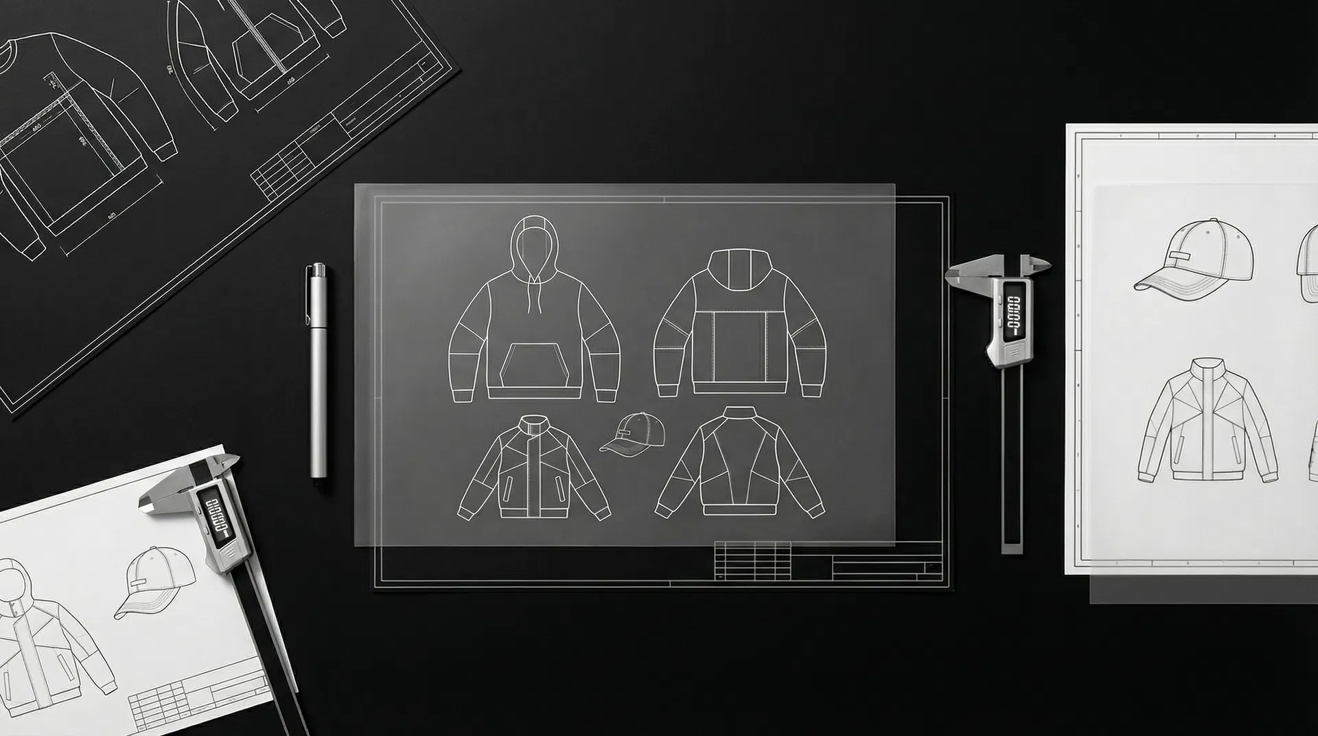 Technical flat sketches, pattern development, and production-ready CAD files. Every stitch planned before the first cut.
